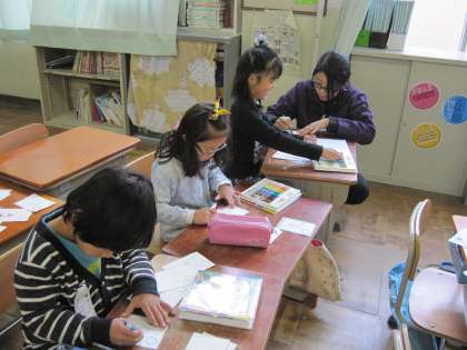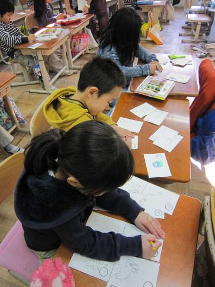 1年2組では,かるた作りをしています。言葉を書き終えた子たちは,絵を描き色を塗りはじめました。