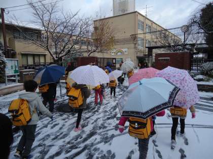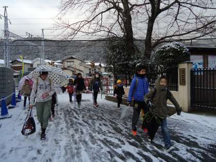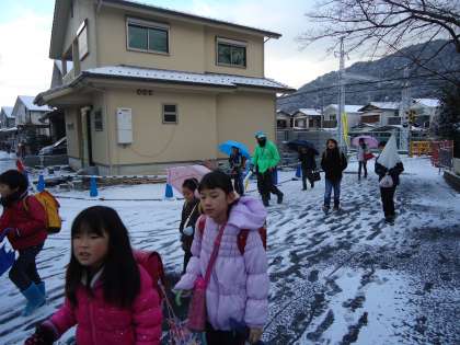 今年初めての雪になりました。白い道を元気に登校です。