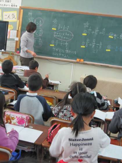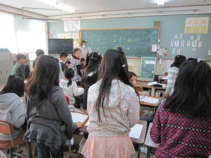 黒板に答えを書いた子らが,立ってみんなに自分の答えを言っていました。