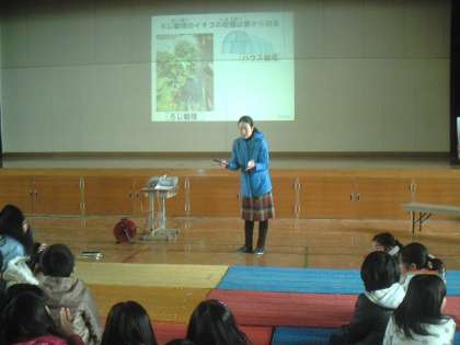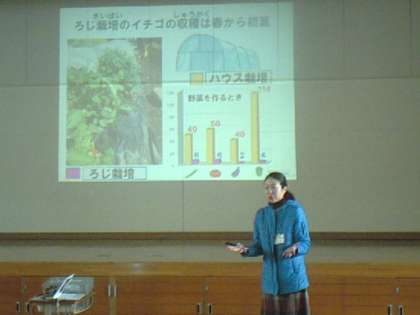 正解を発表した後,エコライフにつながる説明をしていただきました。路地栽培に比べてビニールハウスでいちごを育てるとエネルギーが5倍必要だそうです。