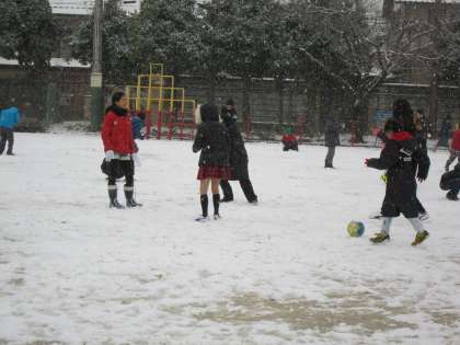 雪遊びばかりかと思っていると,ボールが転がってきました。