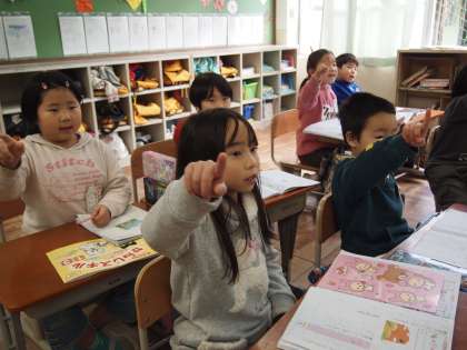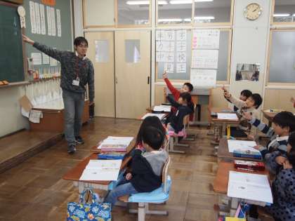 1年2組です。「名」「夕」の二文字を練習しました。指先に力が入ります。