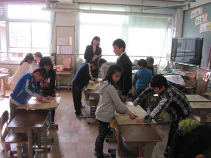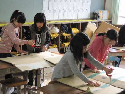 3年2組では,「ダンボールカッターを使って安全にダンボールを切ろう」というめあてをもって学習に取り組み始めました。