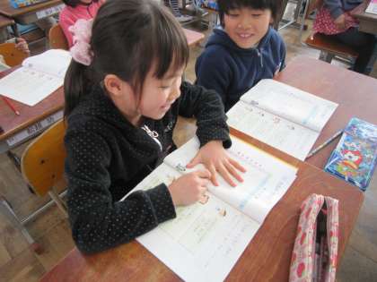 2年1組では,九九の表に答えを書き込んた後,自分で答え合わせをしていました。