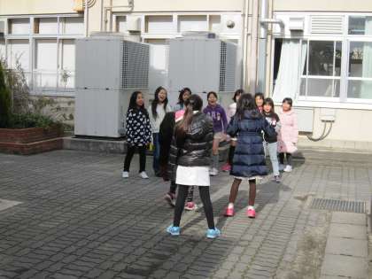 休み時間には,ボールやフリスビーで遊ぶ子が多いですが,遊具や長縄跳びで遊ぶ子もいます。