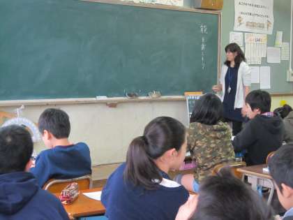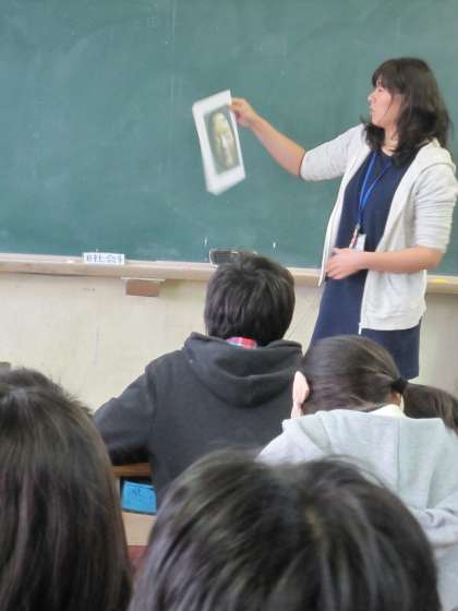 能と狂言の違いを学習するなかで,能で使う「おもて(面)」に興味をもった子ども達。今日は,写真で「おもて(面)」を見せて,「どのような人を表しているのか」などとみんなで考えていました。