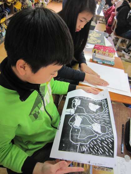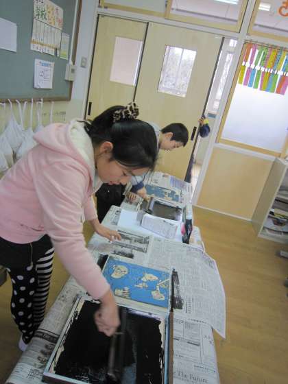 6年1組では,版画を刷ろうとしていました。