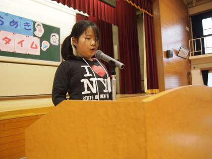 今日は1年生の「きらめきタイム」です。まずは「わたしのたからもの」で2人が発表してくれました。
