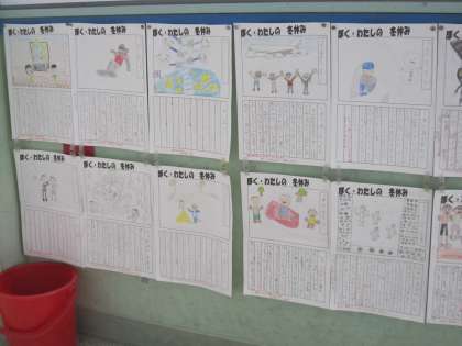 2年2組の廊下に,「冬休みの思い出」作文が掲示されていました。