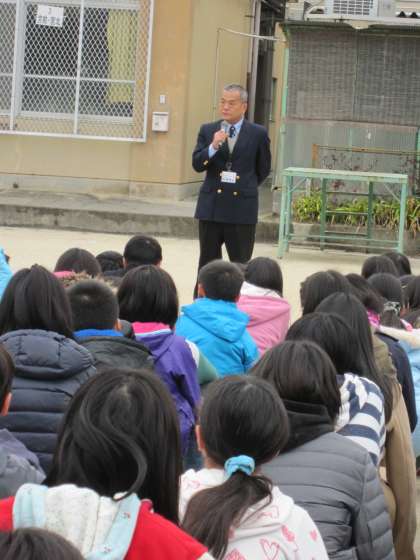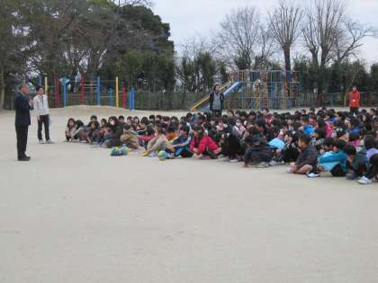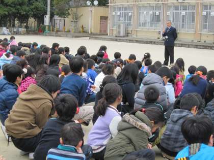 運動場に集まった後,校長より話を聞きました。校長は,阪神淡路大震災の被害のことやそのとき自分が見聞きしたことを話しました。