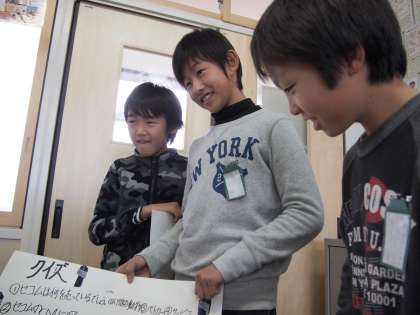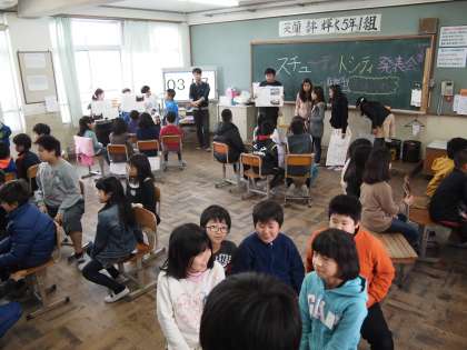 5時間目は5年1組が4年1組にスチューデントシティで学んだことを伝えます。