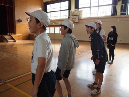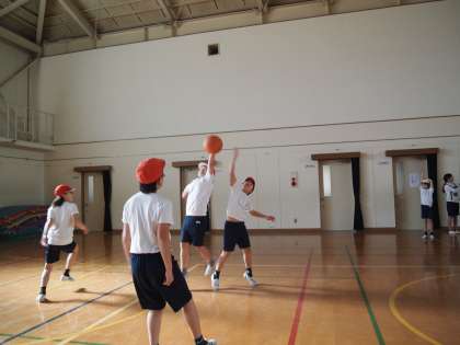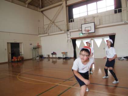 5年2組はバスケットボールの時間。相手の攻撃をうまくかわして味方にパスやシュート…。流れるようなプレーが目立ちました。