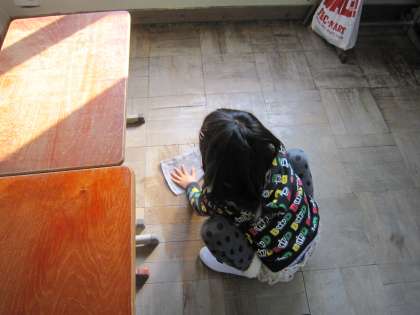 教室の中の床をきれいに拭く子