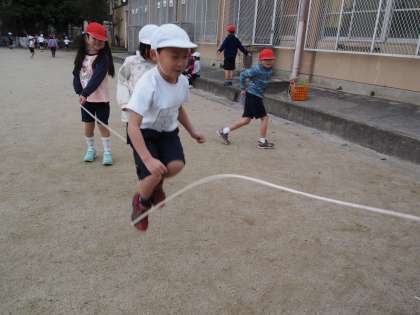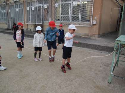 大寒の朝イチ,今日も運動場一番乗りは1年生。まずは縄跳びで体を温めます。