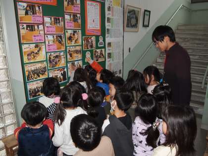 職員室前の掲示板,今はこの前の1年生の「きらめきタイム」の写真が貼られています。みんなで見に来てくれました。