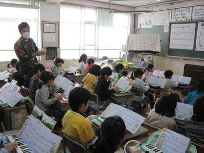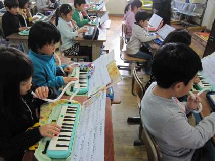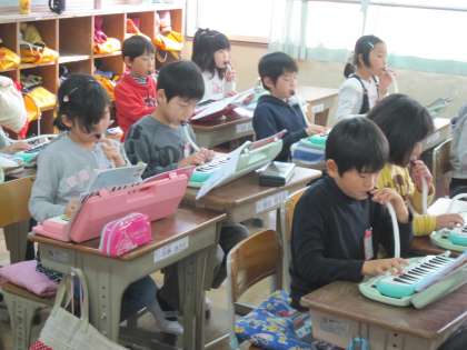 2年1組では,「かねがなる」という曲を鍵盤ハーモニカで演奏しようと練習していました。