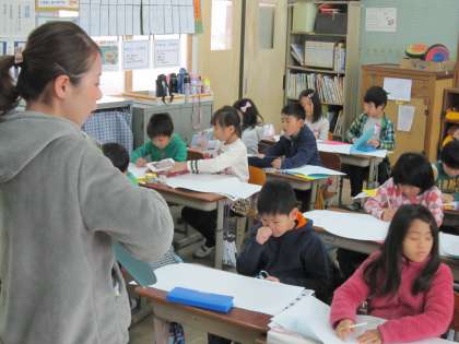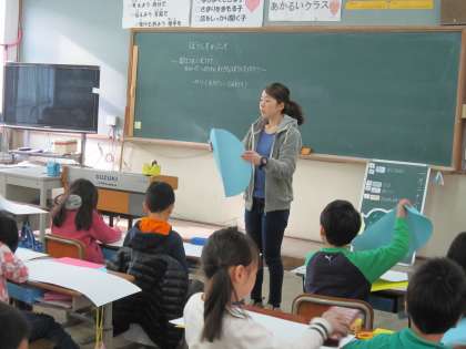 紙を丸くしてかぶるところを作るの所で,丸くするのはできるですが,ノリでとめようとする広がってしまったりして苦労する子が多くいました。