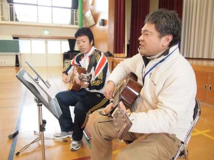 今日は児童集会の日,まずはオープニングはギター兄弟の『やさしくなりたい』(斉藤和義)でスタートです。