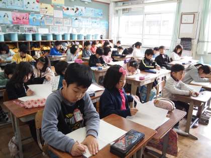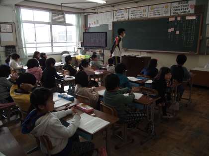 2年1組です。「いつっもやっているあそびを みんなにしょうかいしましょう」というねらいが黒板に書かれていました。みんな楽しそうに考えていましたよ。