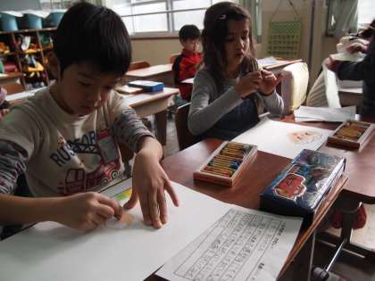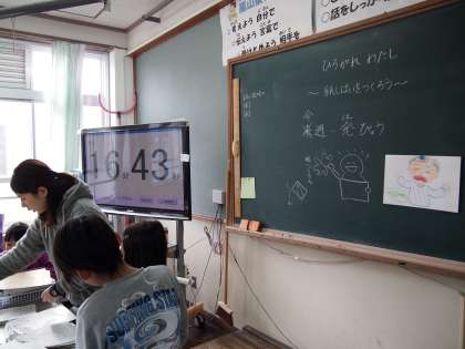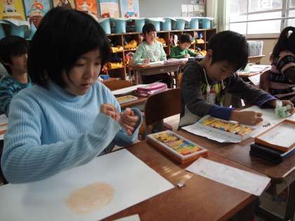2年2組です。前から取り組んでいる「ひろがれ わたし」。今日はかみしばいをつくっていました。