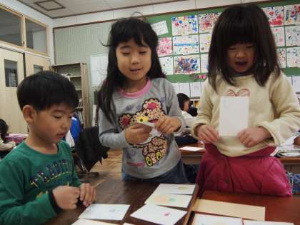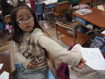 1年2組です。「かいものごっこ」が近くあるそうですが,最後のルール確認やちらしはりを楽しんでいました。