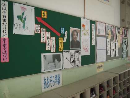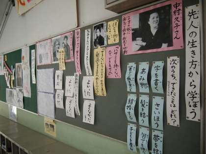 中校舎出入り口の「道徳の広場」の掲示板が模様替えしました。先日の人権参観日の内容を貼り出しています。