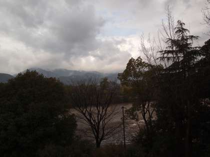 今日は雨が降って愛宕山が煙っています。ここから見える景色は四季を通じて見事に変化していて嵐山東の「絶景ポイント」と言われています。