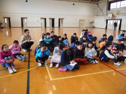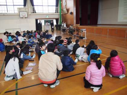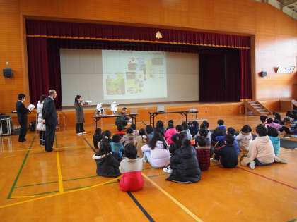 4年生が体育館で勉強しています。今日は村田製作所の方が講師になっての環境学習です。オリジナルの自転車型ロボット「ムラタセイサク君」や一輪車型ロボット「ムラタセイコちゃん」が登場しました。