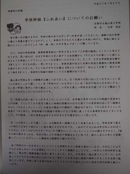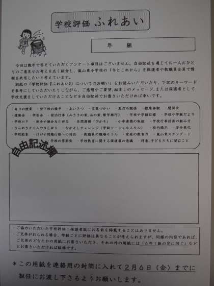 学校評価の後期保護者版の作成に資料になる『ふれあい』を本日配布します。児童1人につき1枚の児童数でお配りします。個人用封筒に入れて2月6日(金)までに担任にお戻しください。学校評価は教育活動の基本になるもので,子どもたちの「学校が楽しい」に向けての我々自身のエネルギーになるものでもあります。どうぞよろしくお願いいたします。