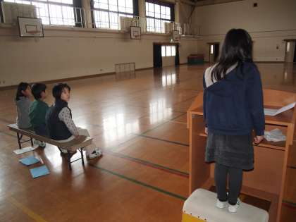 今週は中間休みが「中間マラソン」,昼休みが代表委員が来週の朝会のための練習で「きらめきタイム」のための練習をするのが難しくなっています。今日は給食の配膳中の時間を使っての練習でした。でも,みんな自分からチャレンジした子どもたちばっかりなのでやる気満々です。出した指示にもキビキビと応えてくれて,まさに『打てば響く』状態でした。