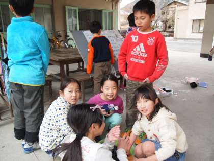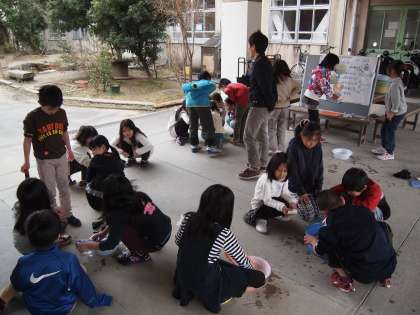 昨日から一気に冷え込みましたが,今日は3年2組が大渡り廊下で手洗いのせんたくをしていました。