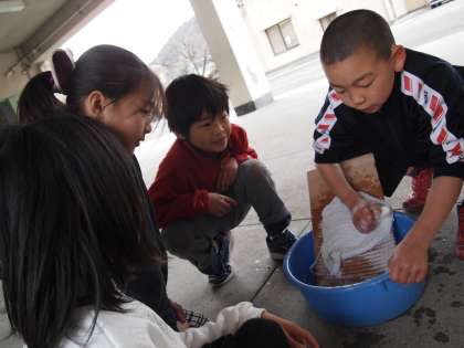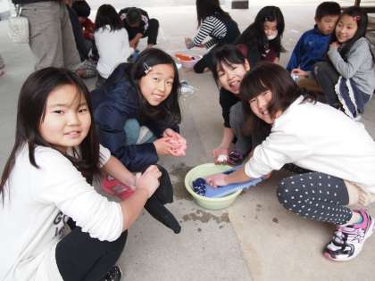 「わぁ〜冷たい!」などと言いながら,みんな楽しそうに手洗いを楽しんでいます。