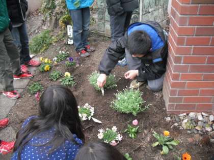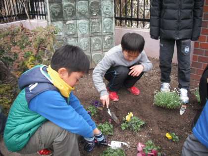 学校の門の前の花壇の花を植えかえました。
