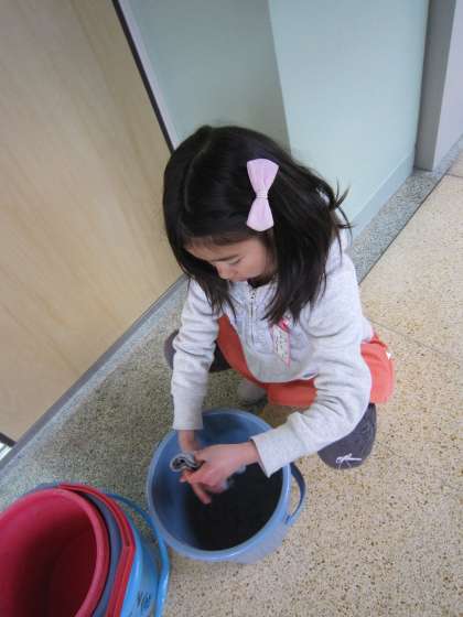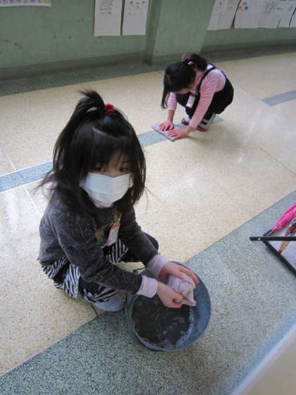 使った雑巾をバケツできれいに洗う子