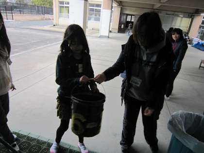 教室から出たごみを管理用務員のもとに届ける子
