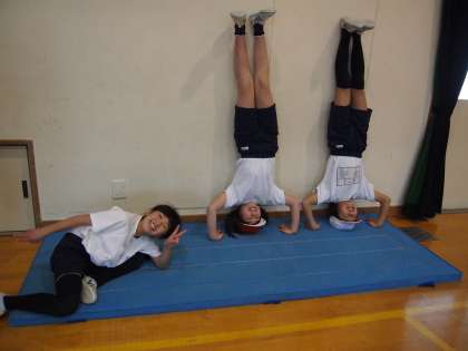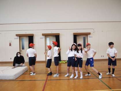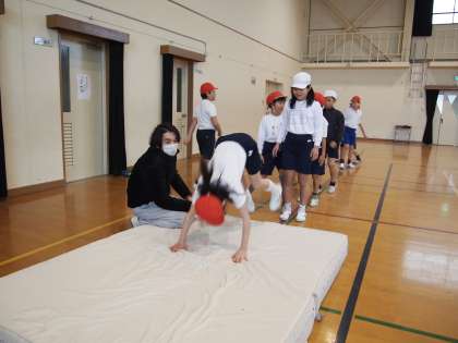 4年1組のマット運動です。ウレタンマットのところでは先生からひと言ひと言アドバイスをもらっていました。
