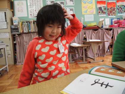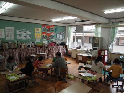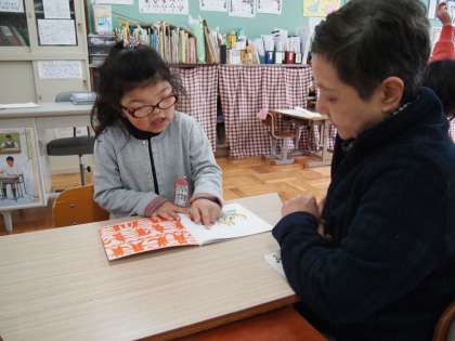 あおぞら学級です。本や絵本の書かれていることを先生に説明しています。