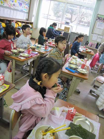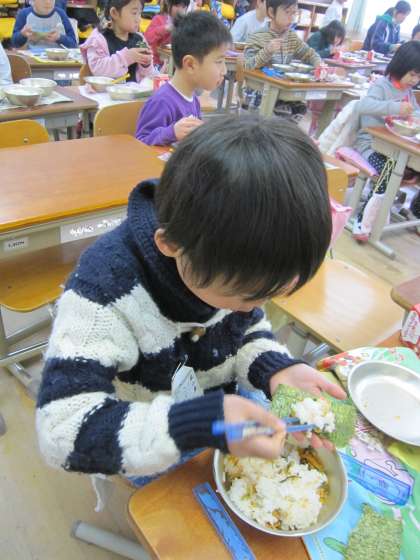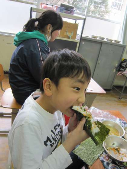 手巻きずしの具を慎重にのりにのせ,おいしく食べていました。