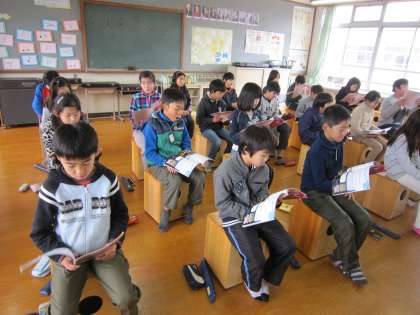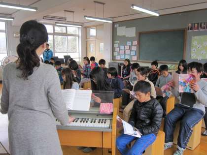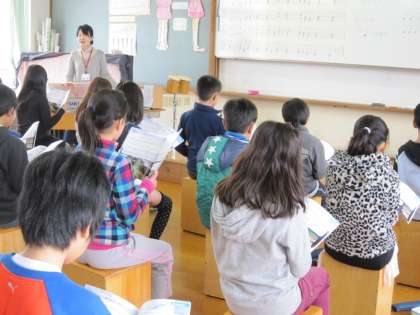 5年1組では,今日はSS(スクールサポーター)の先生と一緒に「風のケーナのロマンス」という曲を練習していました。
