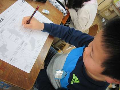 地図に都道府県名を書き込んでいます。漢字でも書けるようにしています。