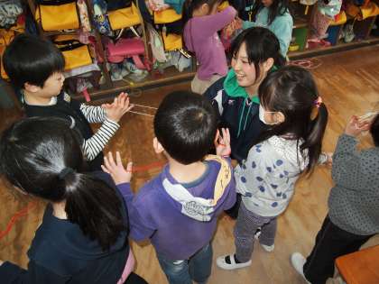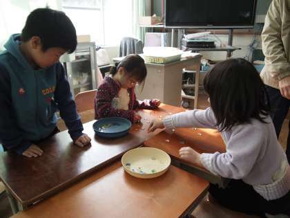1年1組です。おはじきやあやとりなど,むかしのあそびに夢中です。
