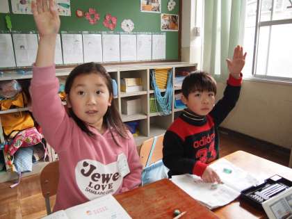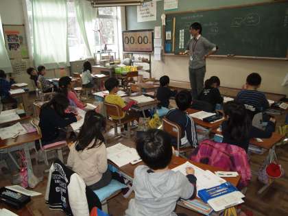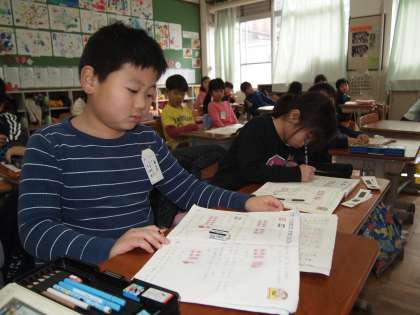 1年2組は算数の時間。「100までのけいさん」です。繰り返しやっているのでみんな理解が進んでいます。