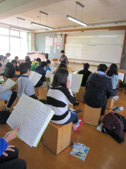 6年2組は,音楽のSS(スクールサポーター)といっしょに合唱の練習をしていました。曲名は「流れゆく雲を見つめて」です。