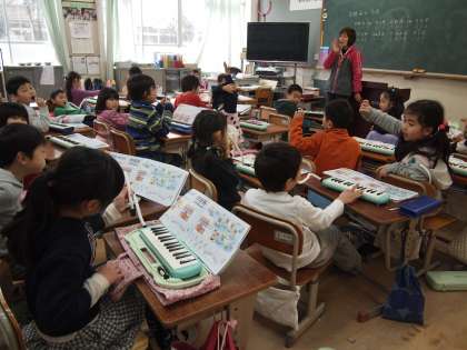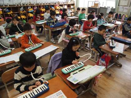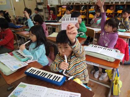 1年1組はけんハモの時間。「よろこびのうた」もずいぶん上手になりましたね。音に自信がこもってきました。