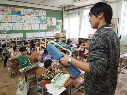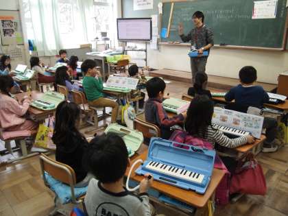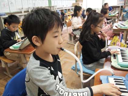 1年2組もけんハモの時間。「かえるのがっしょう」でした。指使いがとってもスムーズになってきました。ビックリです。