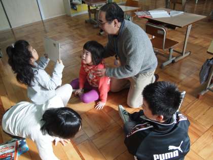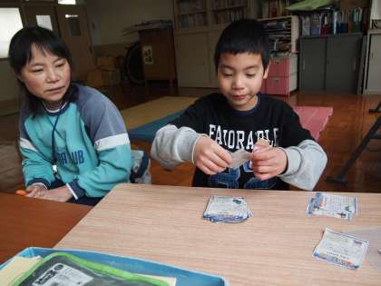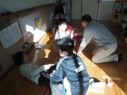 あおぞら学級です。朝の柔らかい光を浴びながら絵本からクイズを出し合ったり絵本を取り合ったり…。片方の部屋では英語で書かれたポケモンカードを整理しています。