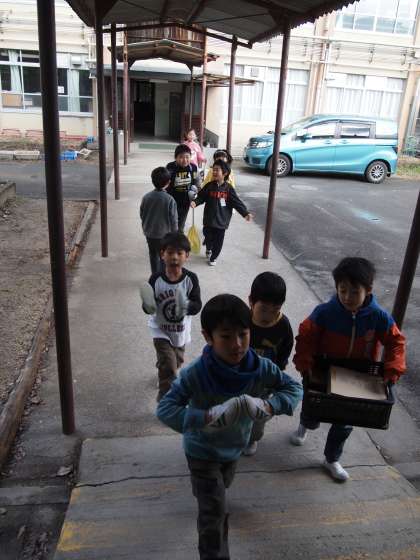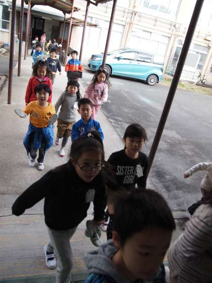 小渡り廊下で1年生の列に出会いました。「どこ行くの?」「体育館に昔遊びをしに行くねん」