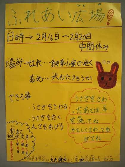 来週から「ふれあい広場」が始まります。ウサギが好きな人はお楽しみに…。