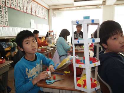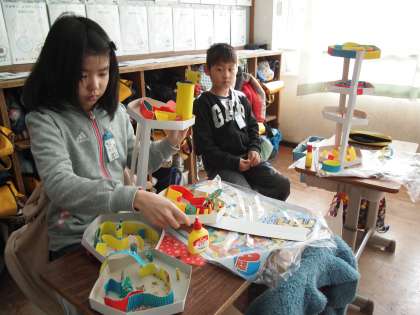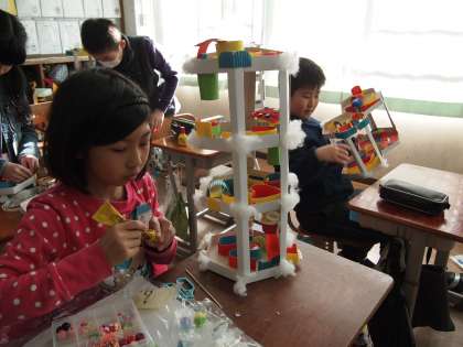 六角形の受け皿にビー玉の通り道を付けていきます。うまく回りながら下の段に落ちていくようにすることがポイントです。