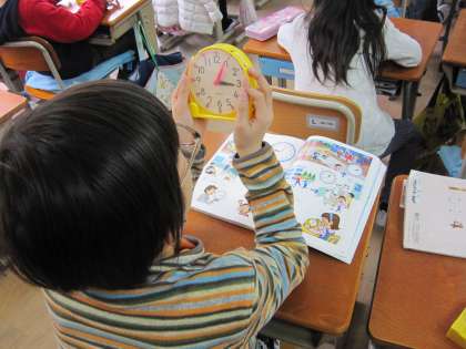 1年1組では,算数で「時計の時刻をよもう」を学習中です。